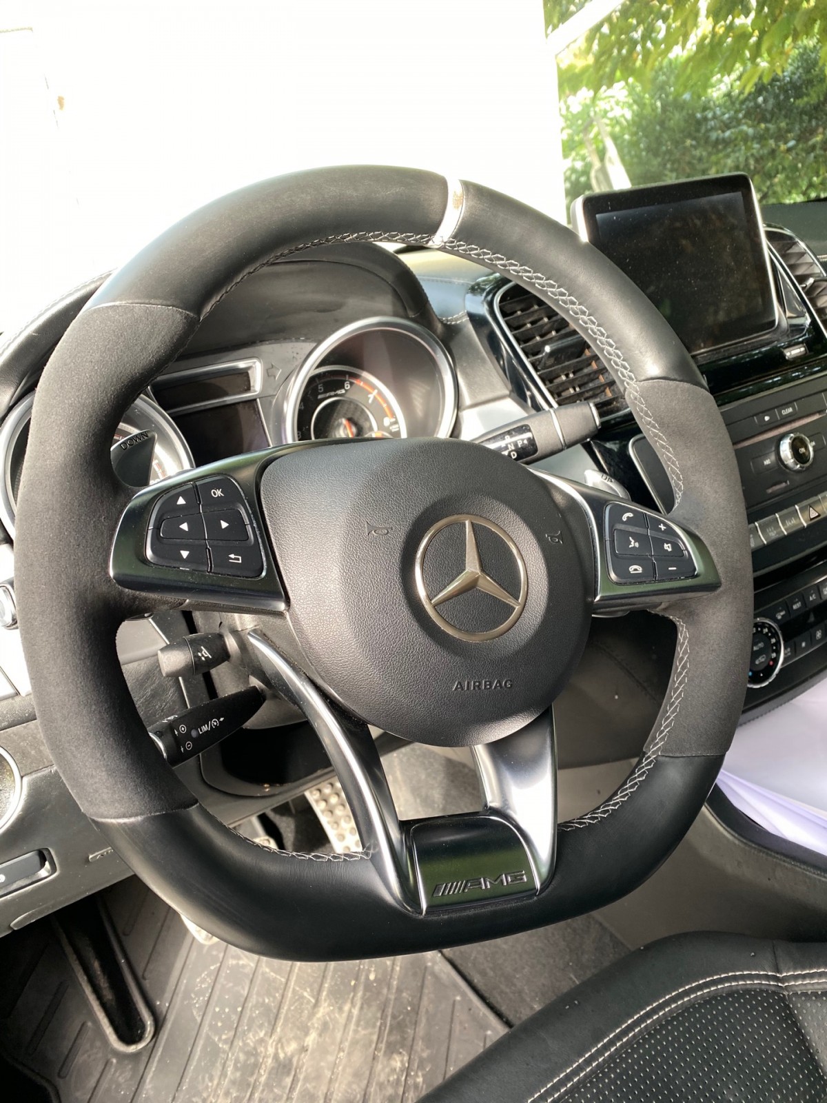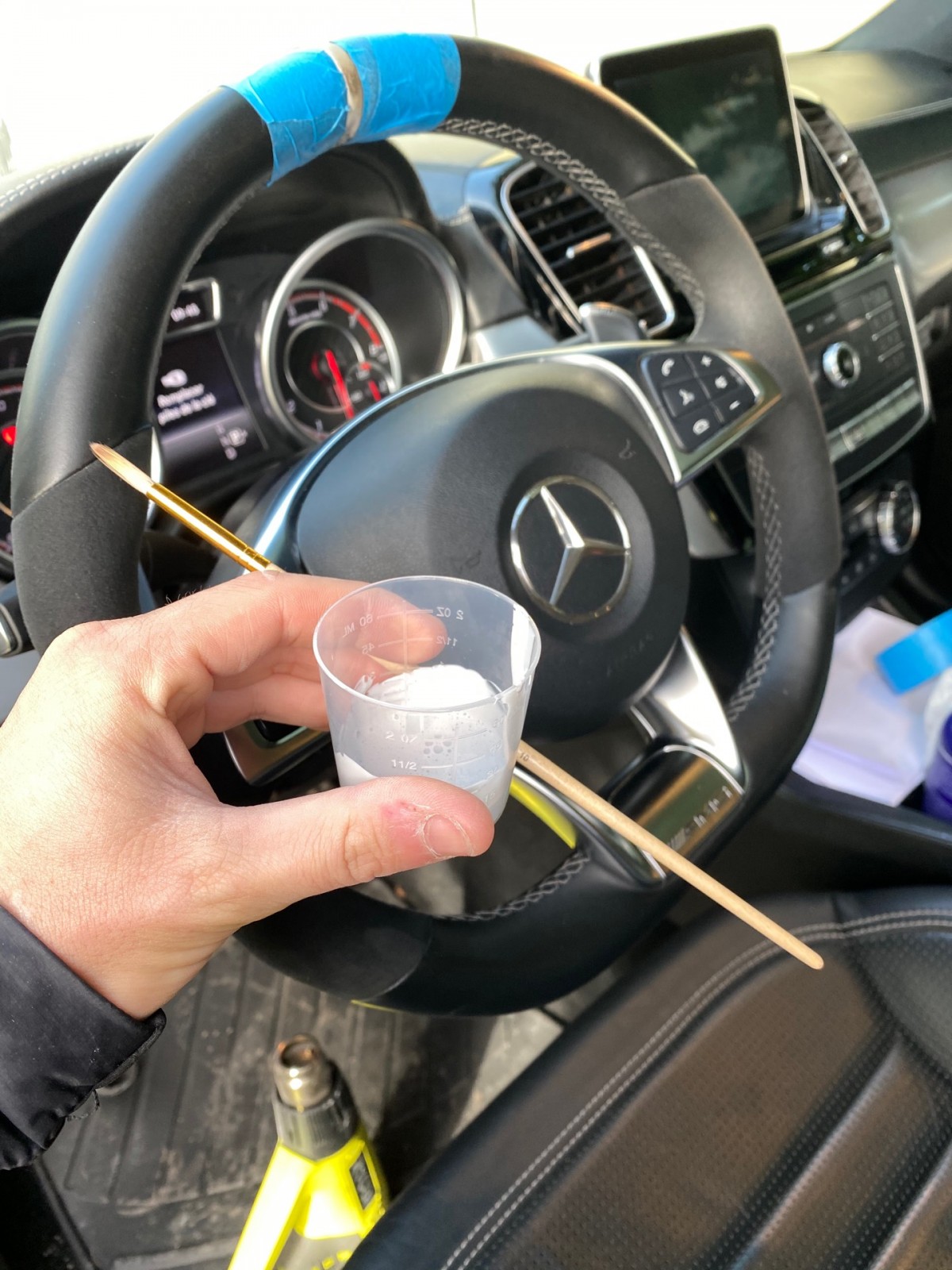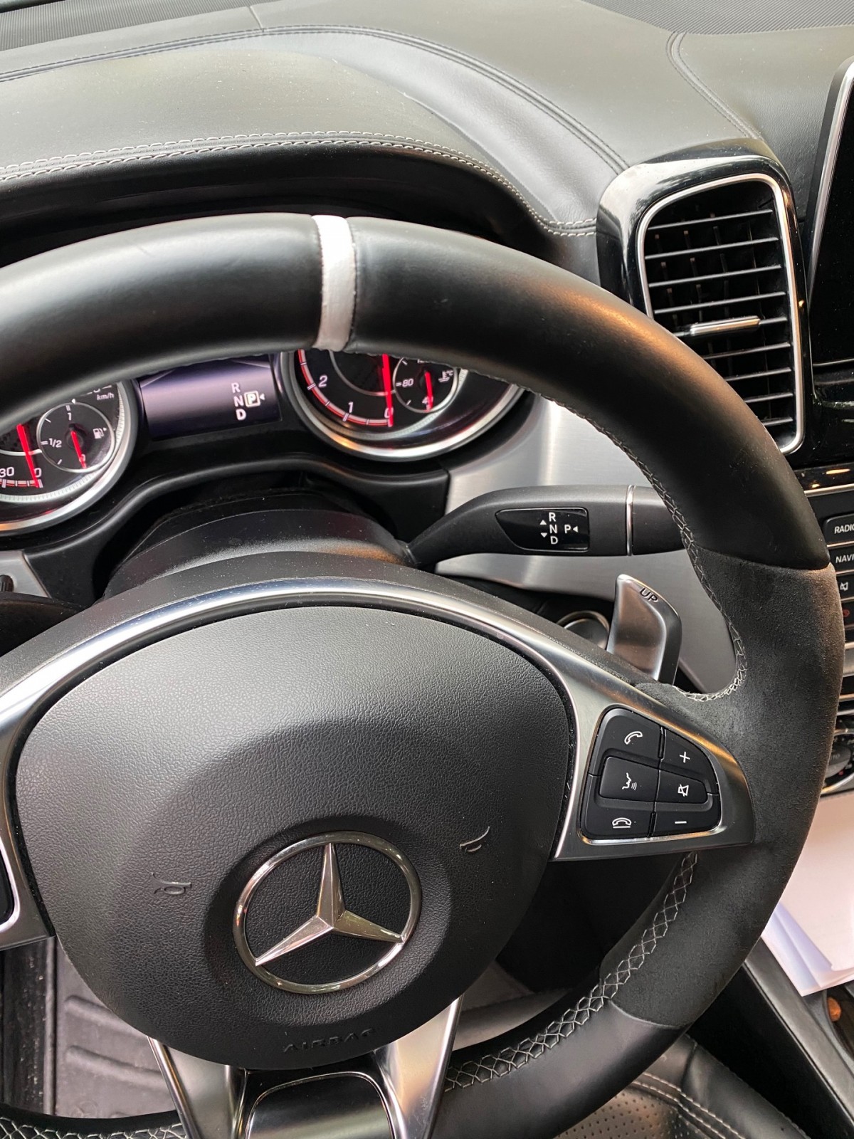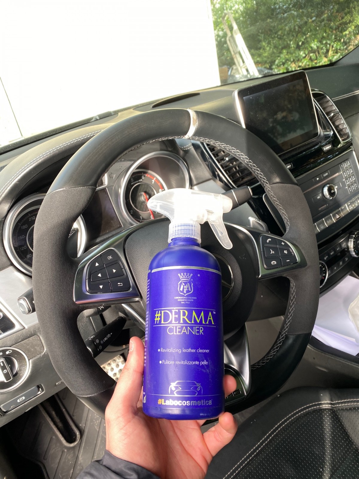 Réparation de la bague « 12 heures » d’un volant en cuir de Mercedes Gle 63s AMG. Le procédé complet aura compris : - nettoyage en profondeur des parties en cuir et alcantara du volant à l’aide de #dermacleaner (produit également disponible à la vente) - décapage du cuir - ponçage afin de lisser de légers défauts de surface - repigmentation à l’aide d’une résine réparatrice colorée afin de favoriser la tenue sur une partie fortement solicitée - application d’un vernis fixatif