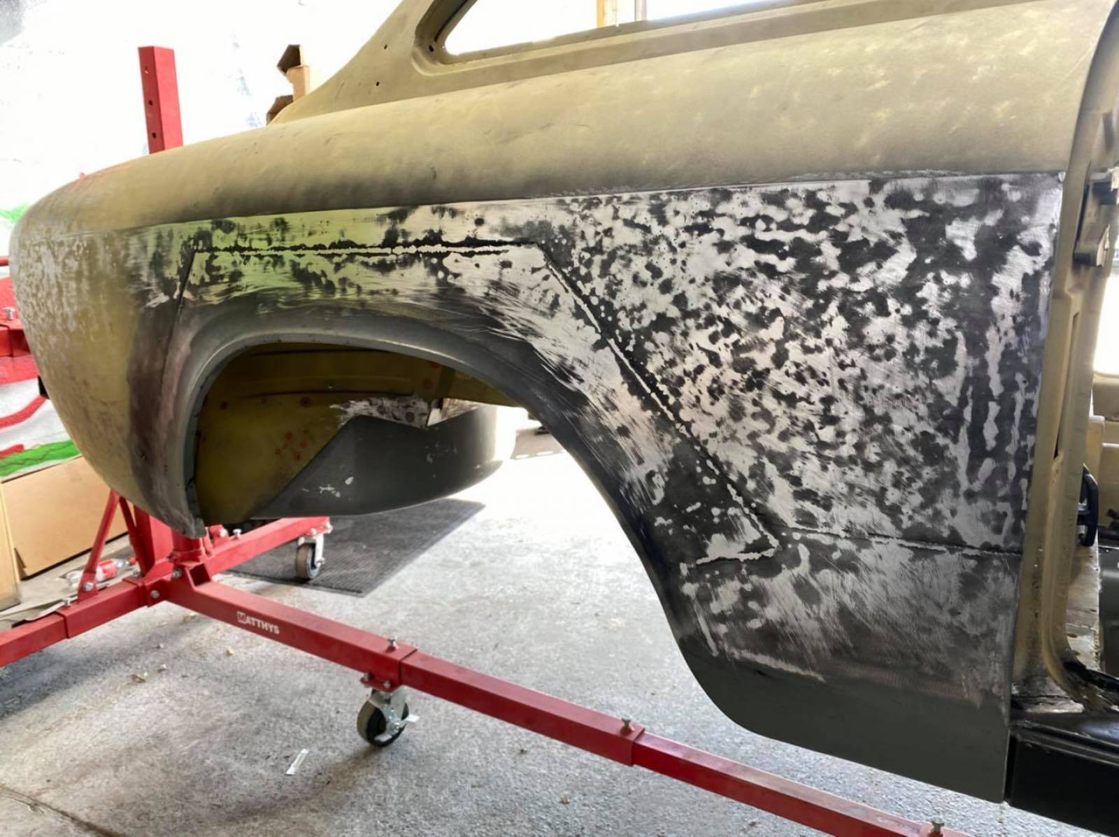 Vous pourrez donc voir sur les photos suivantes le processus de rénovation et de réparation de la carrosserie de cette voiture ancienne de collection que nous avons choisi avec notre client, soyage pour le remplacement des bas d’aile et voile de passage de roues, traitement de corrosion en tout genre etc.